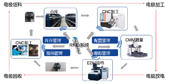 解決方案:對每個電極治具上安裝RFID電子芯片,對電極的設(shè)計延伸到制造、測量和使用的全過程中實現(xiàn)數(shù)據(jù)和制造無縫交互,實現(xiàn)全流程的自動化,無人化。