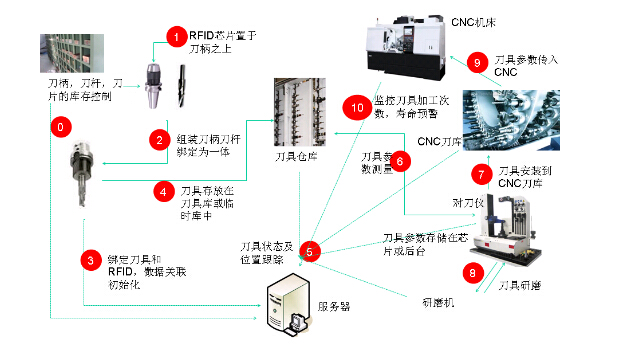 解決方案:在刀柄上安裝RFID標簽,實現(xiàn)對刀具的自動辨識,并自動調(diào)用刀補參數(shù),以及對應(yīng)的加工程序,實現(xiàn)從工件裝夾到完成所有加工工序的智能化,并實現(xiàn)對刀具的全生命周期跟蹤與管控。