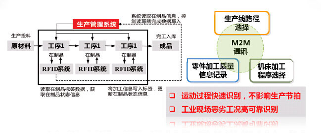 解決方案:在復(fù)雜零件和托盤上安裝RFID標簽,有效識別身份在加工設(shè)備和線體上安裝工業(yè)讀寫器,實現(xiàn)產(chǎn)品和設(shè)備的智能通訊,為MES等信息系統(tǒng)有效提供數(shù)據(jù)采集和處理。