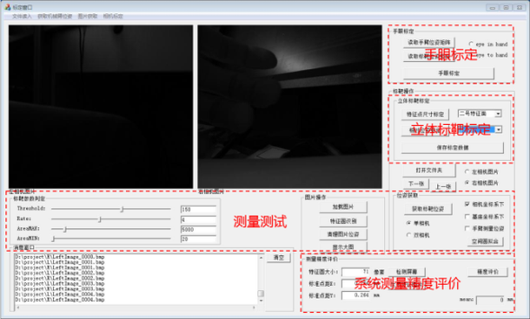系統(tǒng)組成:硬件:該系統(tǒng)的主要硬件有:兩個(gè)工業(yè)相機(jī)(如圖1(a)),主動(dòng)光立體標(biāo)靶(如圖1(b)),工控機(jī)(如圖1(c)),標(biāo)定標(biāo)靶(相機(jī)標(biāo)定標(biāo)靶+特征標(biāo)靶,如圖1(d))。軟件:標(biāo)定,測(cè)量及機(jī)器人控制軟件平臺(tái)(手眼標(biāo)定,立體標(biāo)靶標(biāo)定,系統(tǒng)測(cè)量精度評(píng)價(jià),測(cè)量測(cè)試,圖像采集及測(cè)量,機(jī)器人控制)如圖2所示。測(cè)量深度范圍:500mm~3000m,測(cè)量視場(chǎng)見表1。該系統(tǒng)能夠勝任以下任務(wù):1)機(jī)器人位置姿態(tài)的實(shí)時(shí)測(cè)量;2)機(jī)器人視覺伺服;3)機(jī)器人參數(shù)標(biāo)定;4)機(jī)器人軌跡姿態(tài)性能特性評(píng)定。