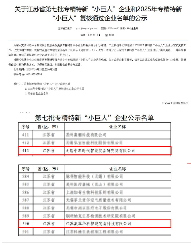 近日,國家工業(yè)和信息化部公示了最新一批國家級(jí)專精特新 “小巨人” 企業(yè)名單,我院衍生孵化企業(yè)江蘇集萃華科智能裝備科技有限公司、無錫中車時(shí)代智能裝備研究院有限公司成功通過評(píng)審認(rèn)定,正式躋身國家級(jí)專精特新 “小巨人” 企業(yè)行列,這是繼黎曼機(jī)器人后我院衍生孵化企業(yè)再次獲此殊榮,也標(biāo)志著兩家企業(yè)的綜合實(shí)力與行業(yè)影響力獲得國家層面的高度認(rèn)可。